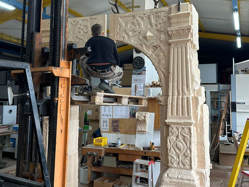 Mithilfe eines hochauflösenden 3D-Scans wurden alle Details des historischen Portals digital erfasst und präzise modelliert. Auf dieser Grundlage rekonstruierte eine Bellheimer Schreinerei das gesamte Portal mit modernster Frästechnik – aus Holz, maßstabsgetreu und ressourcenschonend. Die Replik steht heute in der Nähe des ehemaligen Schlossstandorts und vermittelt anschaulich die kunstvolle Gestaltung und architektonische Wirkung des Originals.